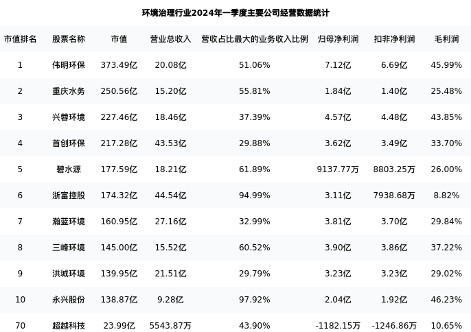 超越科技最新报告期数据为一季度,下表汇总了环境治理行业内市值靠前的公司一季度主要经营数据