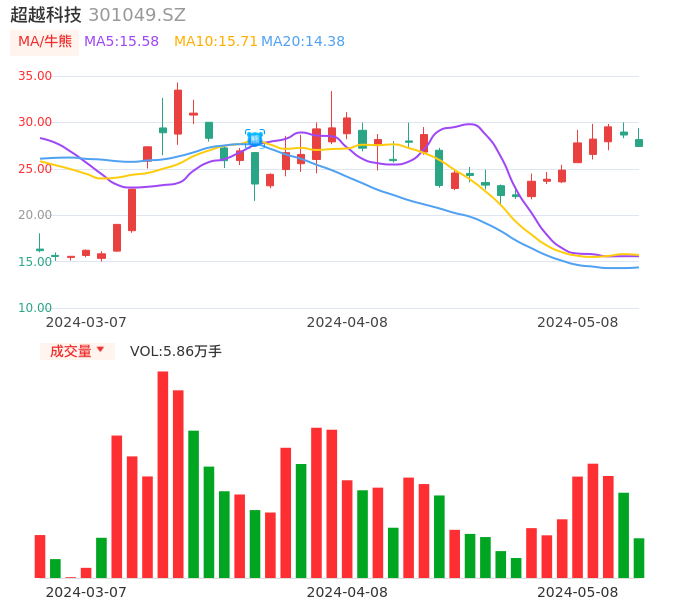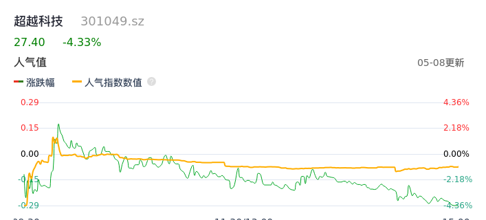 05月08日,超越科技收报27.40,股价涨幅-4.33%,成交金额1.65亿元,换手率22.83%。