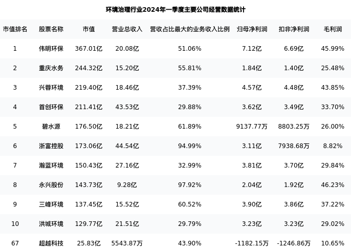 超越科技最新报告期数据为一季度,下表汇总了环境治理行业内市值靠前的公司一季度主要经营数据