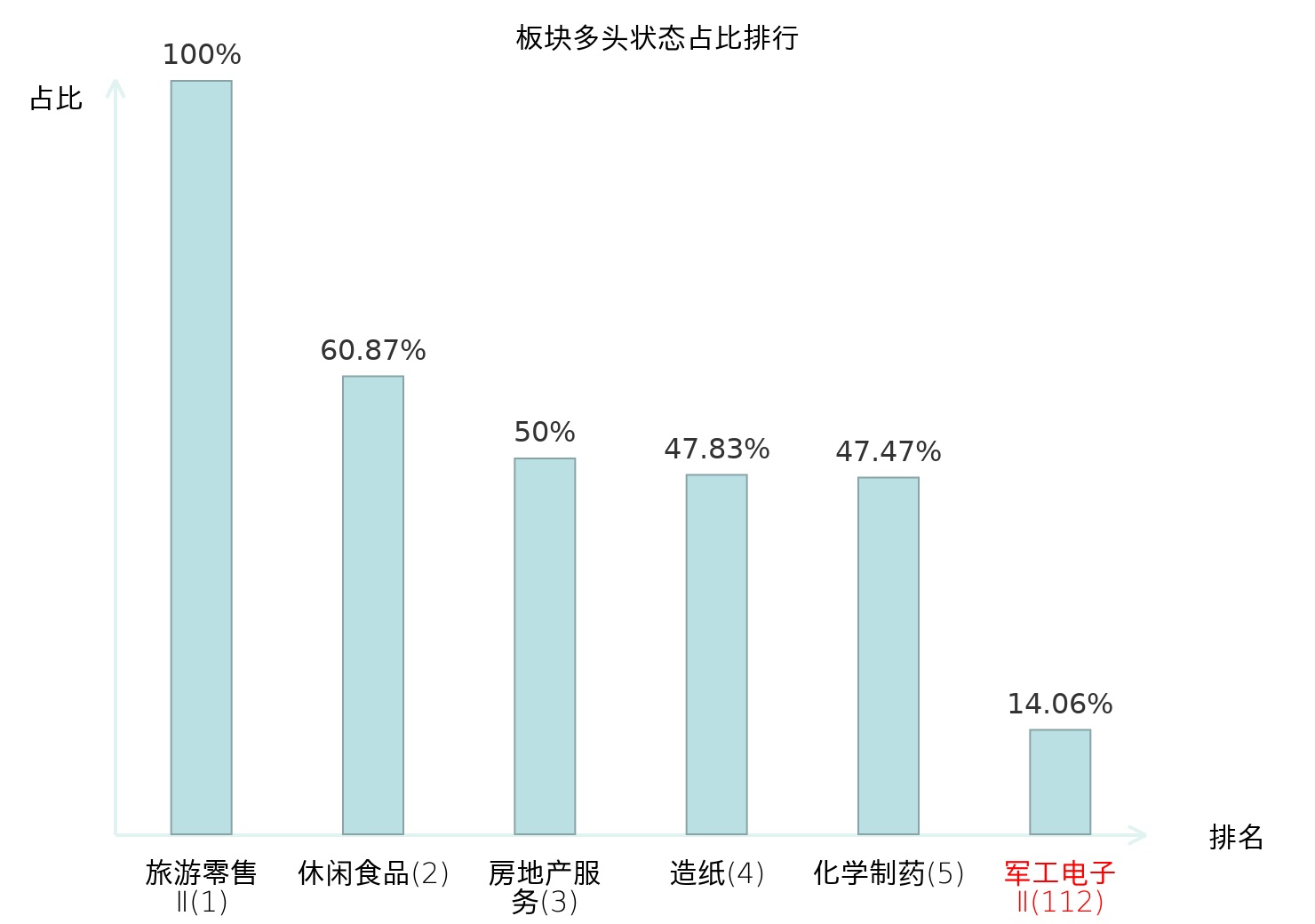 全市场所有行业板块中主力多头状态占比排名中,旅游零售Ⅱ板块位居第一。种植业板块名次提升最快,较昨日上升49位。