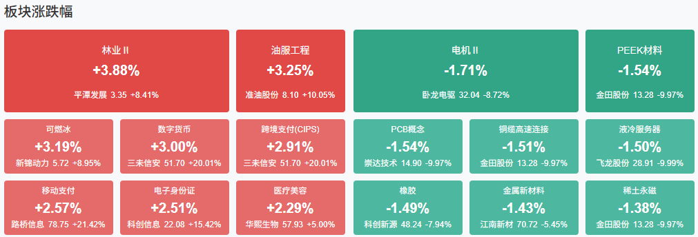 板块方面,数字货币、油气、软件开发、美容护理等板块涨幅居前,液冷服务器、PCB、PEEK材料、稀土永磁等板块跌幅居前。截至收盘,沪指涨0.35%,深成指涨0.45%,创业板指涨0.21%。
