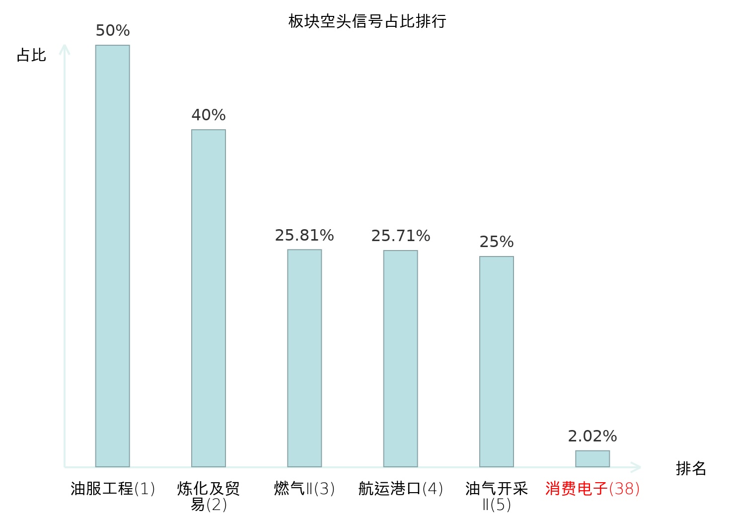全市场所有行业板块中主力空头信号占比排名中,油服工程板块位居第一。炼化及贸易板块名次提升最快,较昨日上升124位。