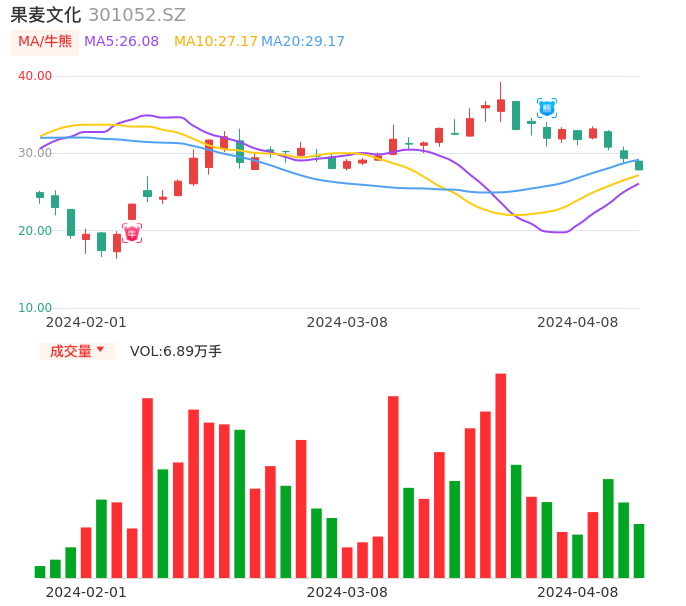 04月08日,果麦文化收报27.86,股价涨幅-5.08%,成交金额1.95亿元,换手率9.24%。