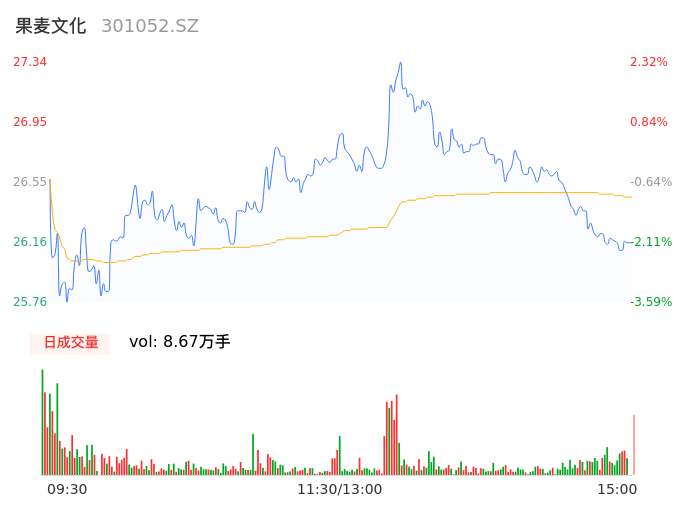 04月18日,果麦文化收报26.17,股价涨幅-2.06%,成交金额2.30亿元,换手率11.65%。