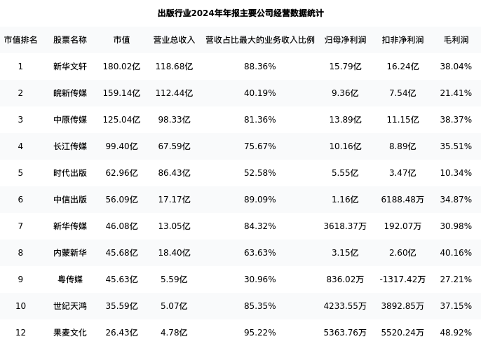 果麦文化最新报告期数据为年报,下表汇总了出版行业内市值靠前的公司年报主要经营数据