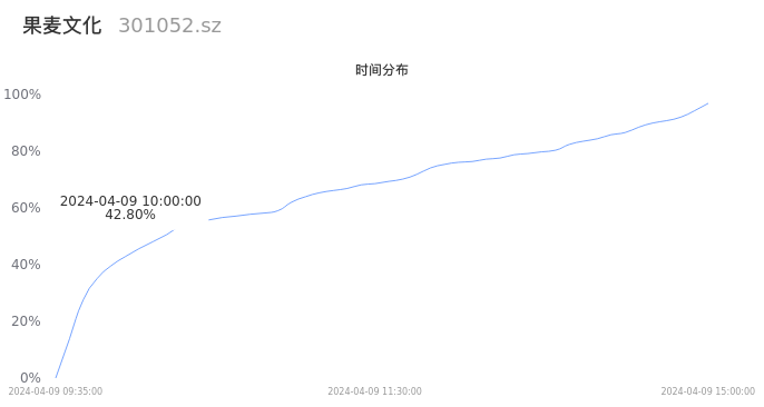 301052果麦文化2024年04月09日成交6.38万手,成交金额1.82亿元,相较昨日缩量5184手,换手率8.55%,成交清淡。