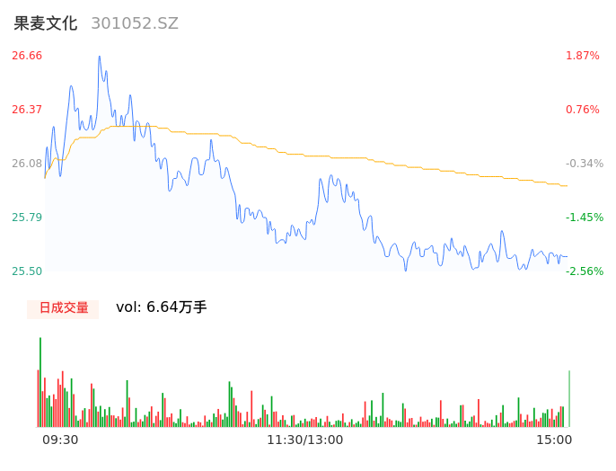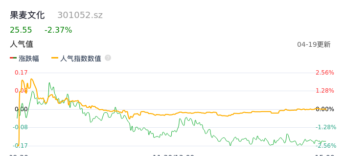 04月19日,果麦文化收报25.55,股价涨幅-2.37%,成交金额1.72亿元,换手率8.90%。