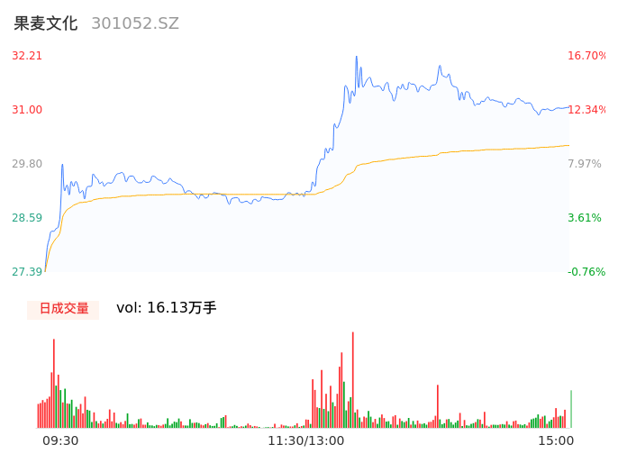04月11日,果麦文化收报31.05,股价涨幅12.50%,成交金额4.87亿元,换手率21.62%。