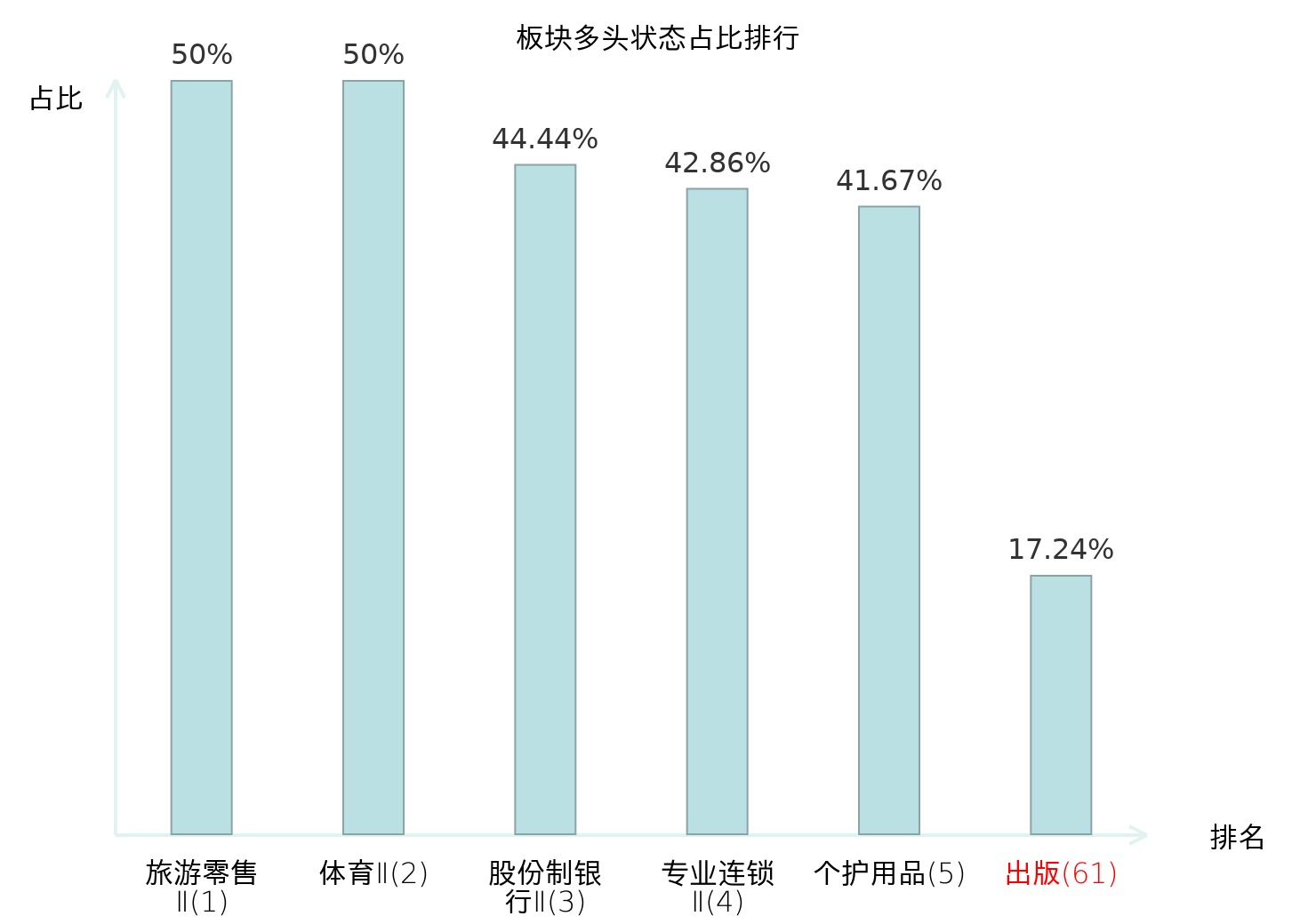 全市场所有行业板块中主力多头状态占比排名中,旅游零售Ⅱ板块位居第一。贵金属板块名次提升最快,较昨日上升83位。