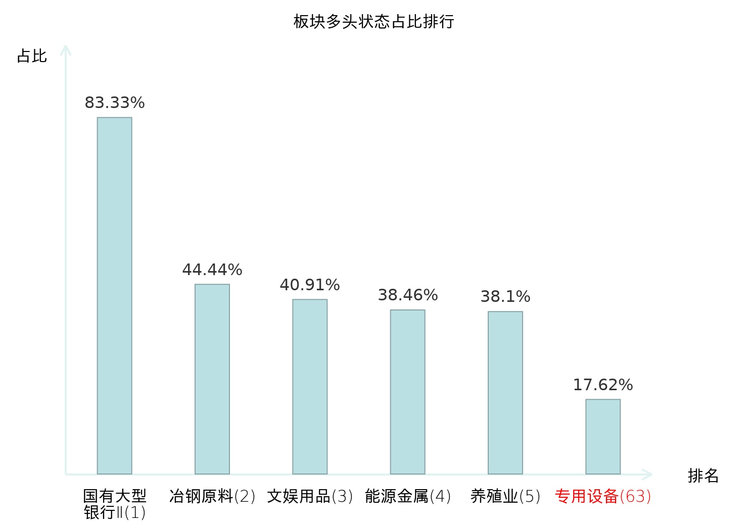 全市场所有行业板块中主力多头状态占比排名中,国有大型银行Ⅱ板块位居第一。影视院线板块名次提升最快,较昨日上升54位。