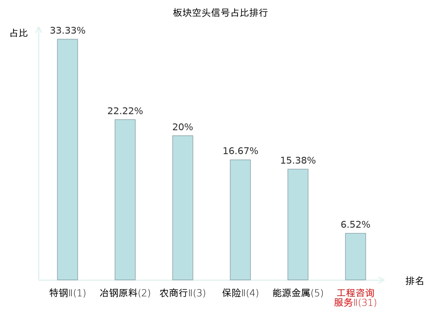 全市场所有行业板块中主力空头信号占比排名中,特钢Ⅱ板块位居第一。其他电子Ⅱ板块名次提升最快,较昨日上升117位。