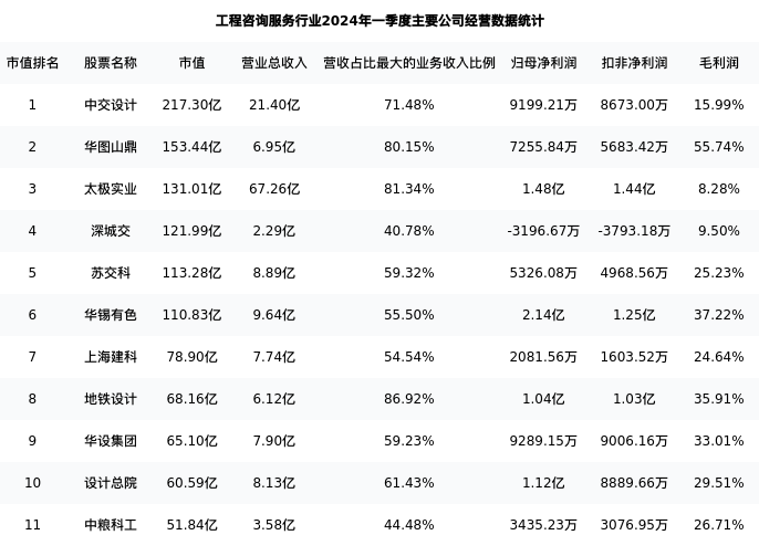中粮科工最新报告期数据为一季度,下表汇总了工程咨询服务行业内市值靠前的公司一季度主要经营数据