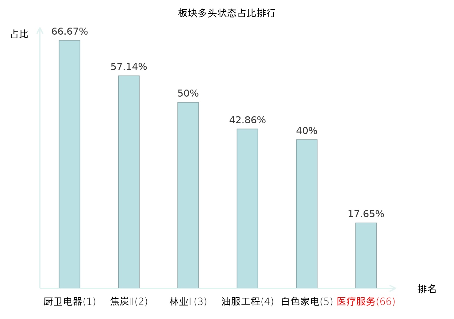 全市场所有行业板块中主力多头状态占比排名中,厨卫电器板块位居第一。风电设备板块名次提升最快,较昨日上升98位。