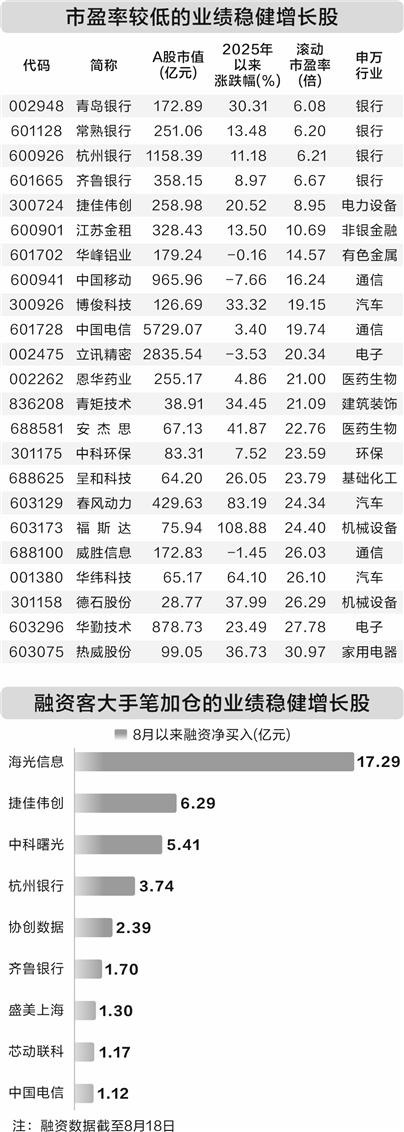 据数据宝统计,从估值水平来看,截至8月19日收盘,这45家业绩稳健增长的公司中,滚动市盈率低于30倍的有22家。其中5家滚动市盈率低于10倍,分别是青岛银行、常熟银行、杭州银行、齐鲁银行和捷佳伟创。