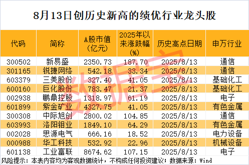 仅8月13日,就有11只绩优的行业龙头股盘中股价创历史新高,包括鹏鼎控股、三美股份、紫金矿业、锐捷网络、华工科技等。