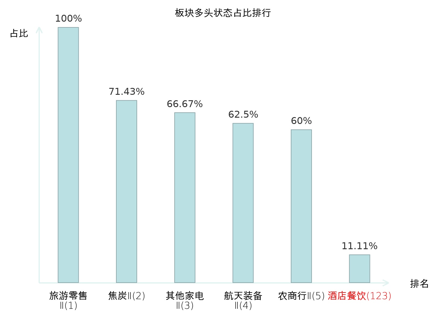 全市场所有行业板块中主力多头状态占比排名中,旅游零售Ⅱ板块位居第一。白酒Ⅱ板块名次提升最快,较昨日上升50位。