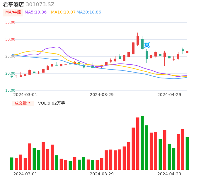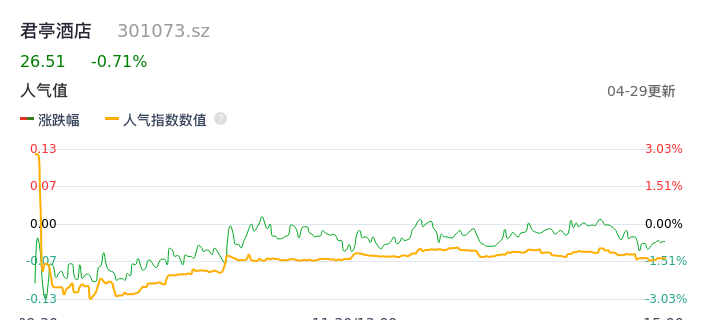 04月29日,君亭酒店收报26.51,股价涨幅-0.71%,成交金额2.54亿元,换手率11.29%。