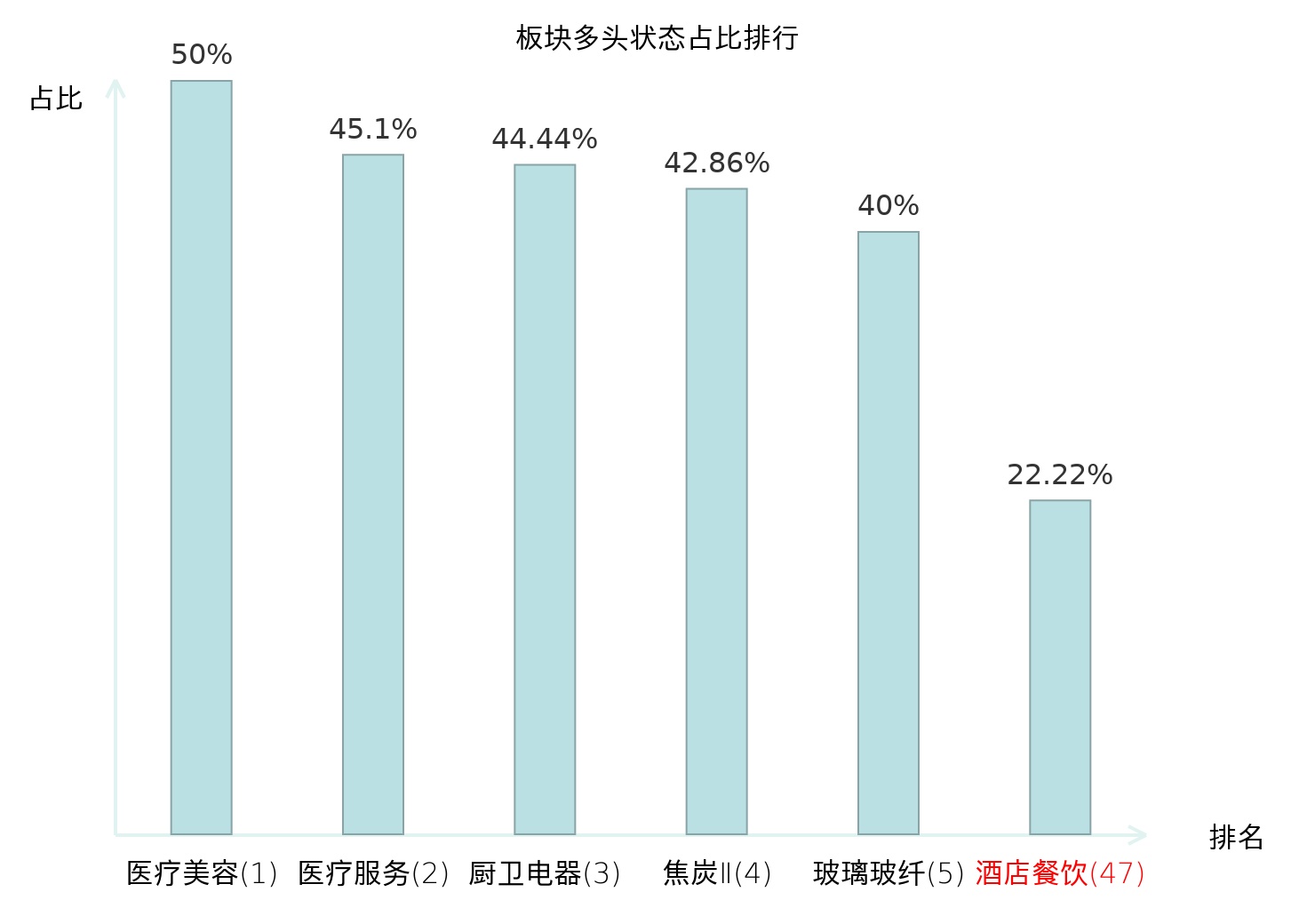 全市场所有行业板块中主力多头状态占比排名中,医疗美容板块位居第一。养殖业板块名次提升最快,较昨日上升90位。