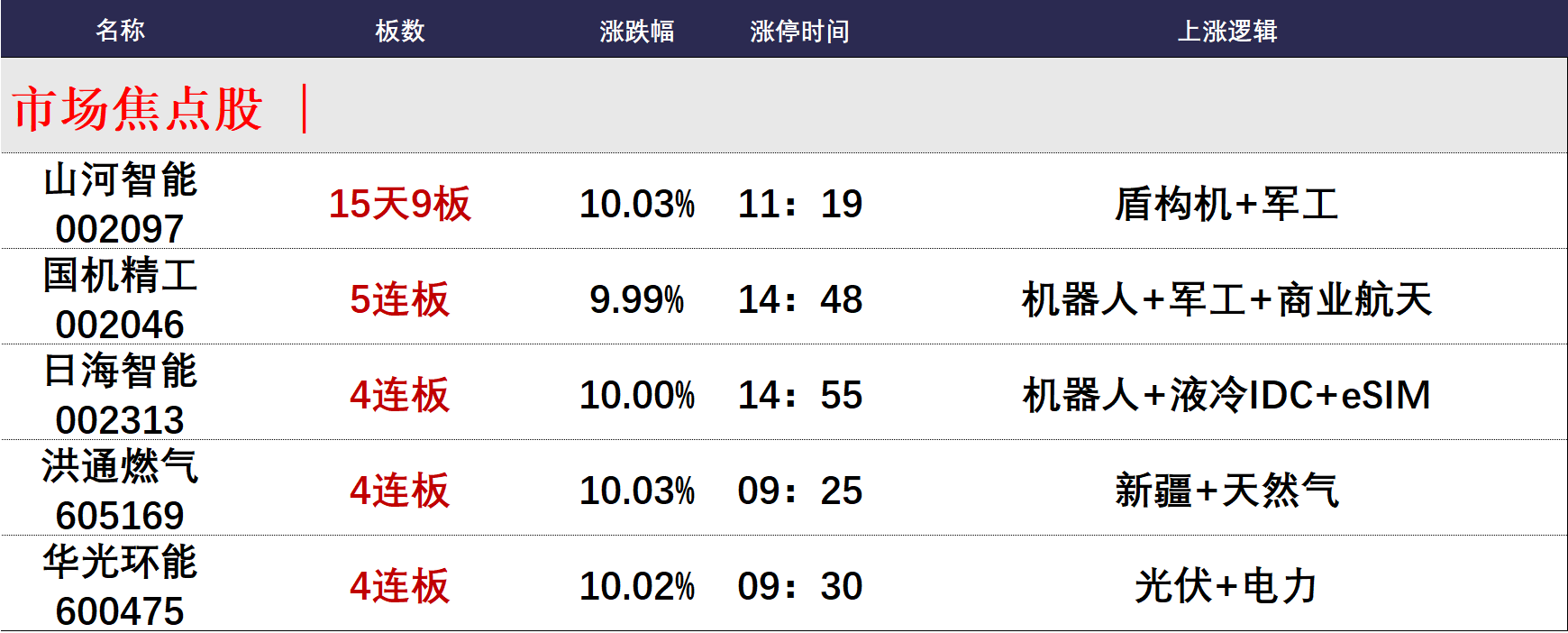 板块方面,商业航天概念持续活跃,国机精工5连板,航天科技4天3板,飞沃科技、德恩精工20CM涨停;午后新疆本地股、高铁轨交板块异军突起,洪通燃气4连板,新疆交建、北新路桥、青松建化等个股涨停,消息面上,天眼查工商信息显示,近日,新藏铁路有限公司成立,注册资本950亿人民币。