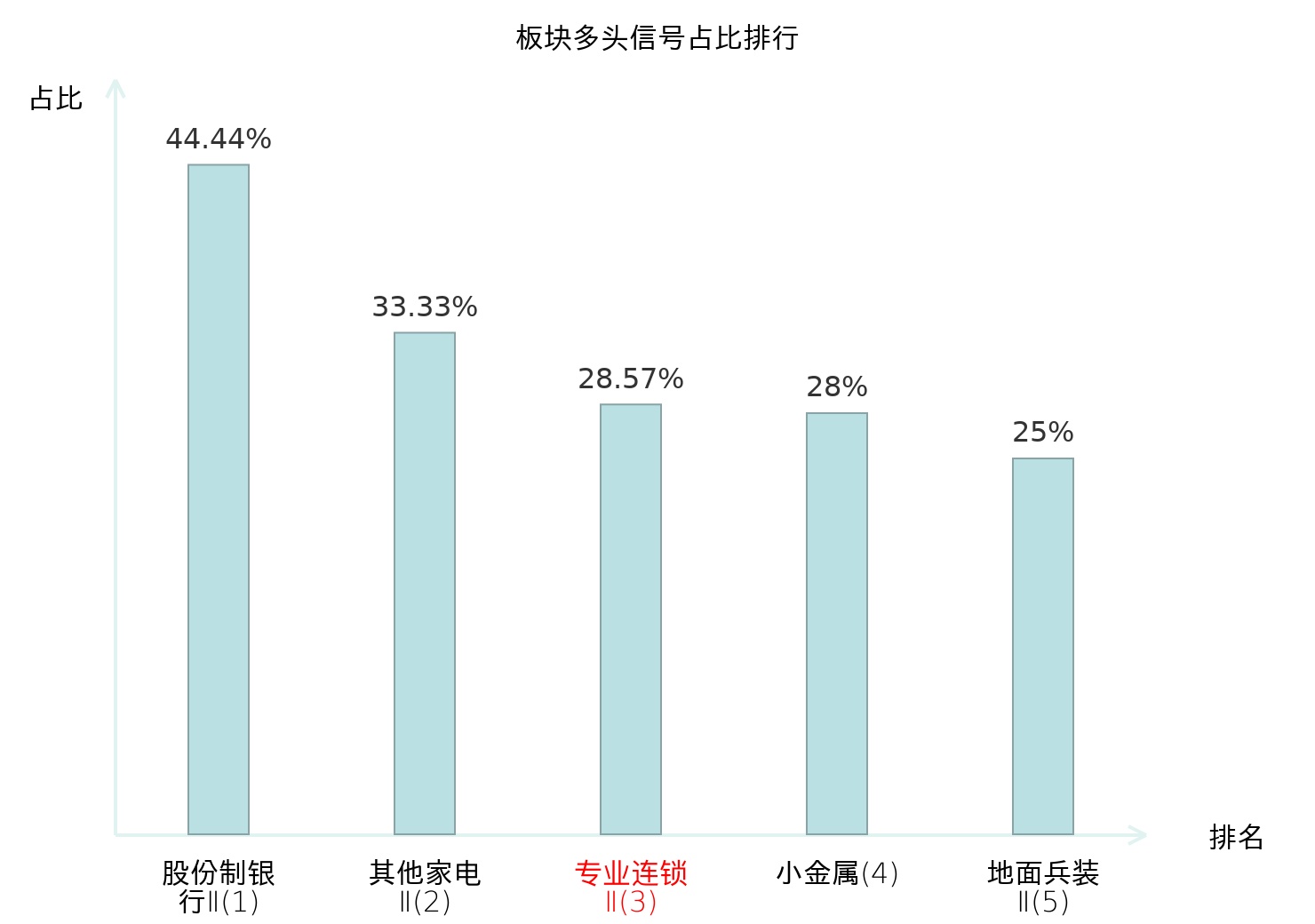 全市场所有行业板块中主力多头信号占比排名中,股份制银行Ⅱ板块位居第一。其他家电Ⅱ板块名次提升最快,较昨日上升127位。