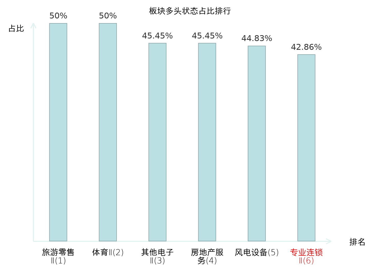 全市场所有行业板块中主力多头状态占比排名中,旅游零售Ⅱ板块位居第一。其他家电Ⅱ板块名次提升最快,较昨日上升112位。
