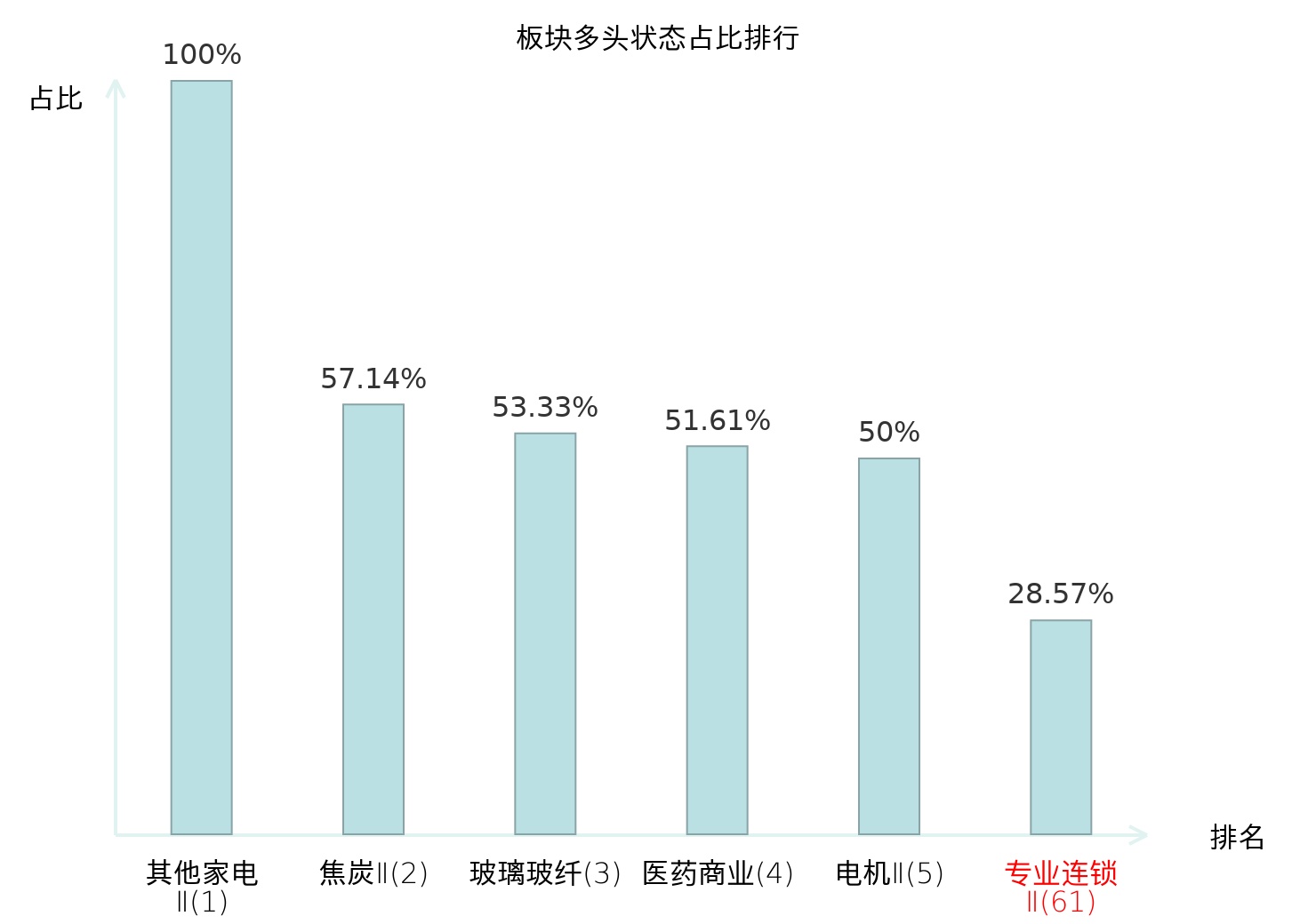 全市场所有行业板块中主力多头状态占比排名中,其他家电Ⅱ板块位居第一。白色家电板块名次提升最快,较昨日上升67位。