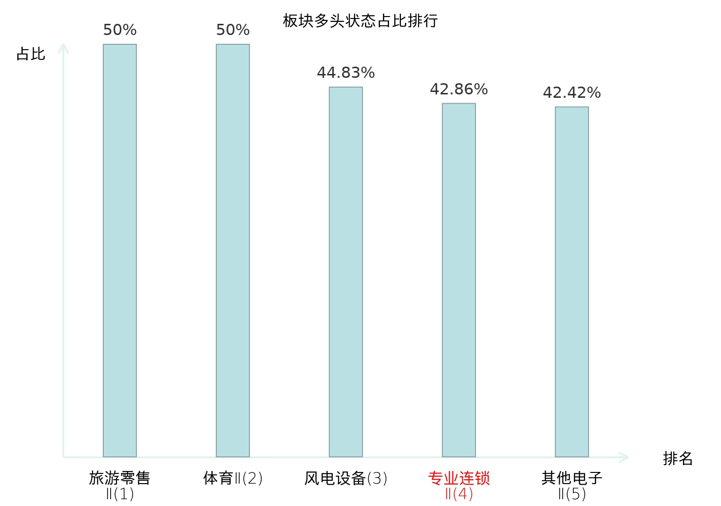 全市场所有行业板块中主力多头状态占比排名中,旅游零售Ⅱ板块位居第一。化妆品板块名次提升最快,较昨日上升66位。