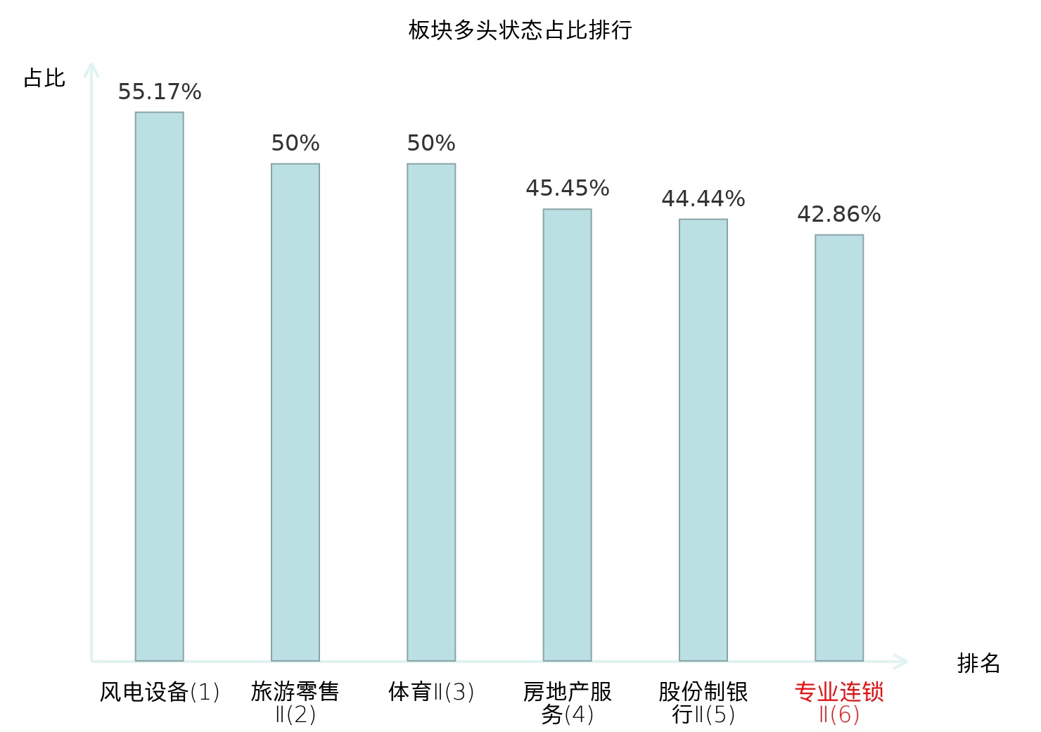 全市场所有行业板块中主力多头状态占比排名中,风电设备板块位居第一。保险Ⅱ板块名次提升最快,较昨日上升64位。
