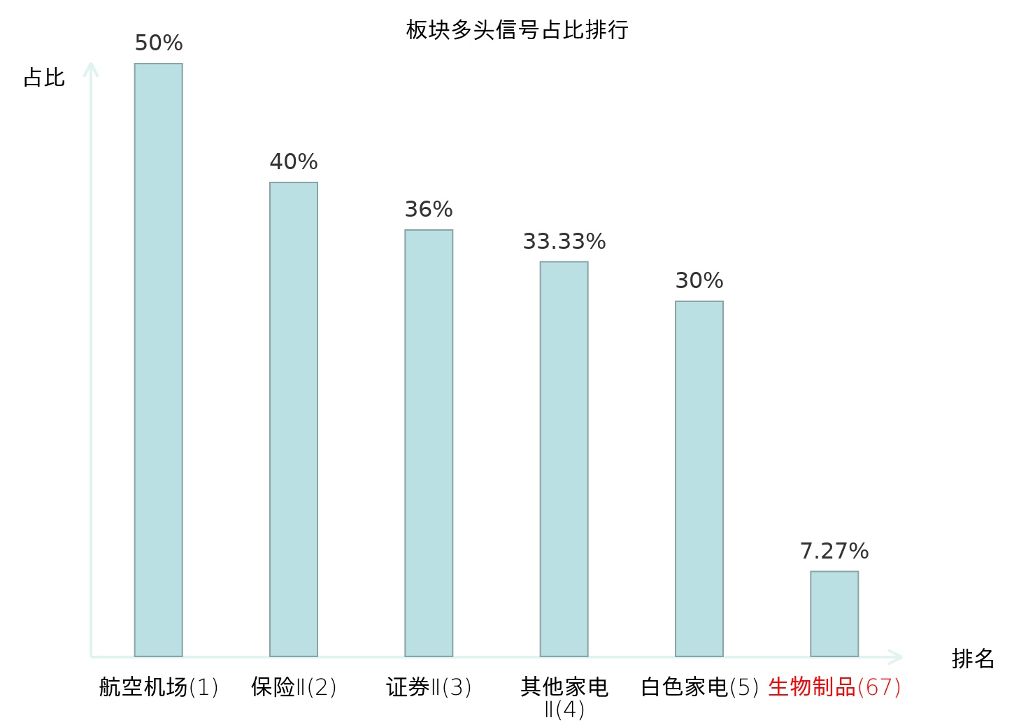 全市场所有行业板块中主力多头信号占比排名中,航空机场板块位居第一。其他家电Ⅱ板块名次提升最快,较昨日上升126位。