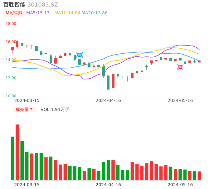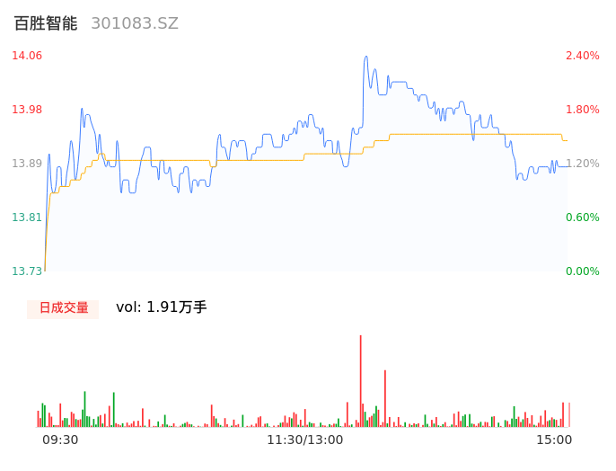 05月16日,百胜智能收报13.92,股价涨幅1.38%,成交金额2658.84万元,换手率3.48%。