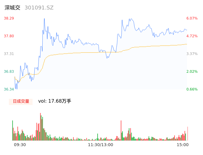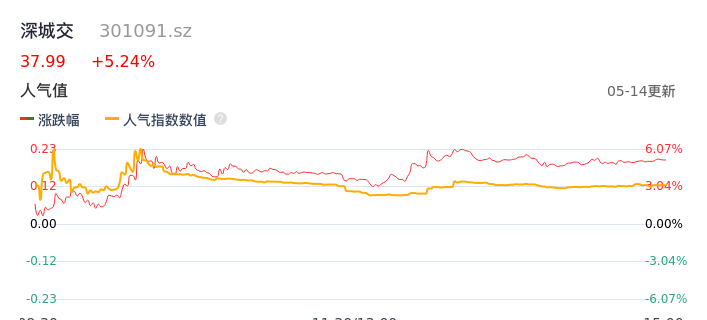 05月14日,深城交收报37.99,股价涨幅5.24%,成交金额6.65亿元,换手率11.93%。