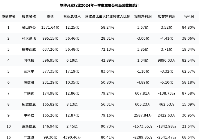 广立微最新报告期数据为一季度,下表汇总了软件开发行业内市值靠前的公司一季度主要经营数据