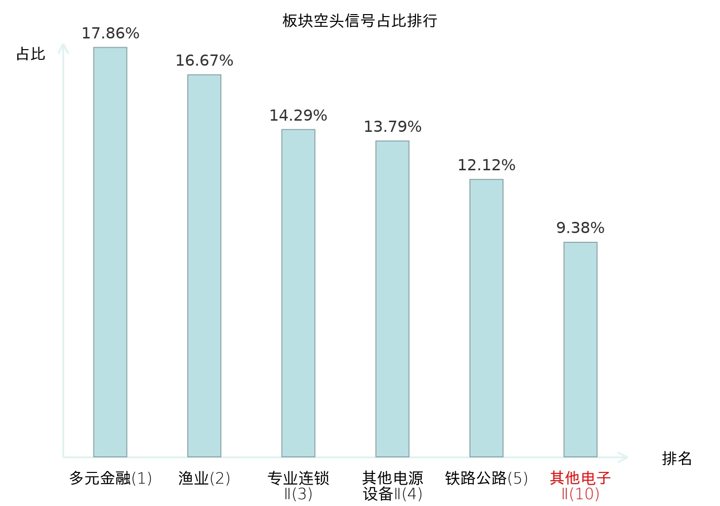 全市场所有行业板块中主力空头信号占比排名中,多元金融板块位居第一。多元金融板块名次提升最快,较昨日上升128位。