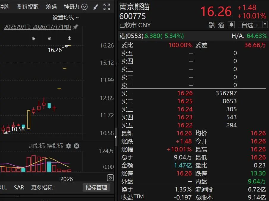南京熊猫(600775)作为板块中的明星个股,1月7日继续涨停,已收获三连板。在异动公告中,公司表示近期脑机接口概念引发市场广泛关注,但公司尚无与脑机接口相关的成熟产品,亦未形成相关销售收入,相关概念不会对公司当前生产经营活动产生实质性影响。