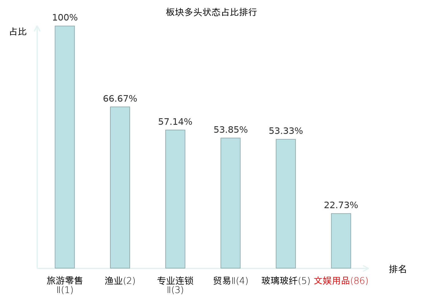 全市场所有行业板块中主力多头状态占比排名中,旅游零售Ⅱ板块位居第一。农业综合Ⅱ板块名次提升最快,较昨日上升83位。