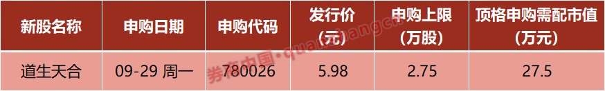 本周(9月29日—10月3日)有1只新股发行。周一:道生天合。