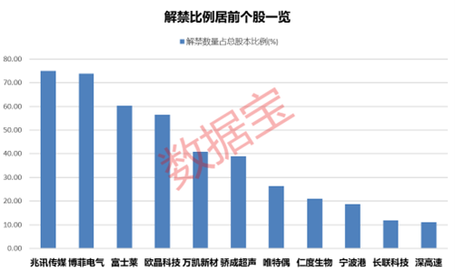 解禁比例来看,兆讯传媒、博菲电气、富士莱、欧晶科技的解禁比例居前,均超50%。