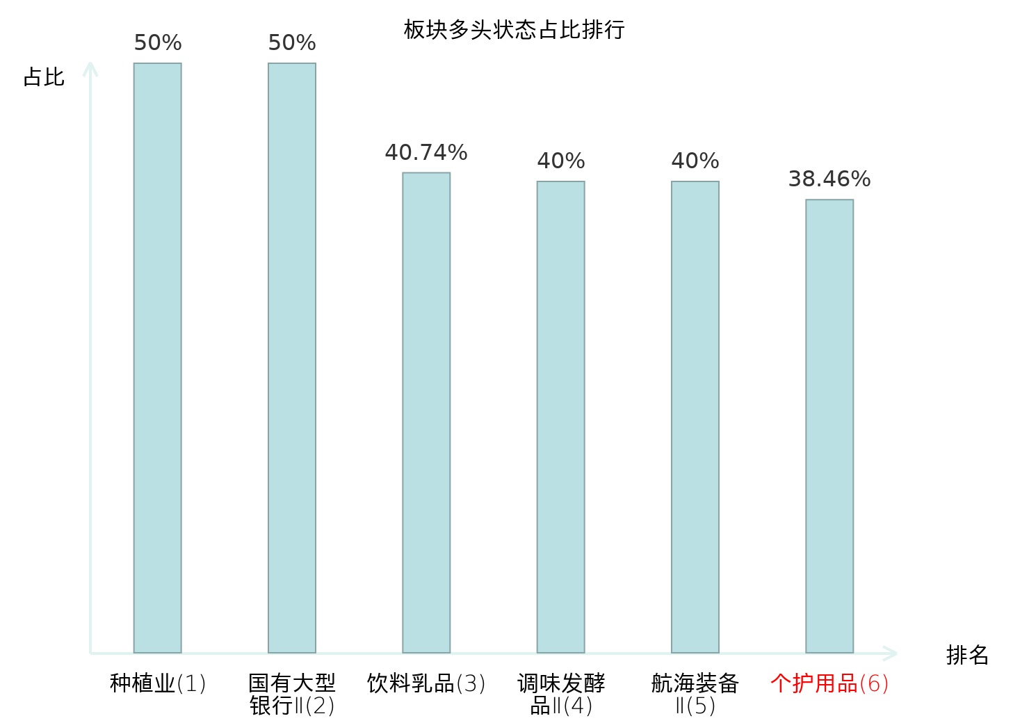 全市场所有行业板块中主力多头状态占比排名中,种植业板块位居第一。冶钢原料板块名次提升最快,较昨日上升89位。