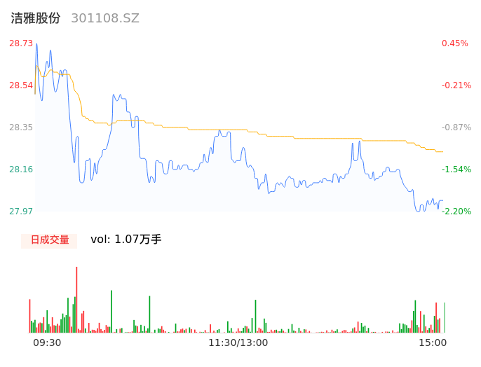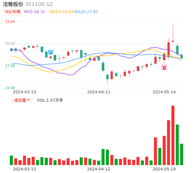 05月14日,洁雅股份收报28.01,股价涨幅-2.06%,成交金额3027.55万元,换手率3.04%。