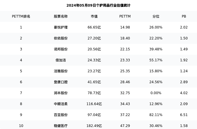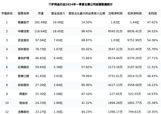 洁雅股份最新报告期数据为一季度,下表汇总了个护用品行业内市值靠前的公司一季度主要经营数据