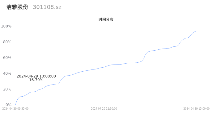 301108洁雅股份2024年04月29日成交4221手,成交金额1143.51万元,相较昨日放量1905手,换手率1.20%,成交清淡。