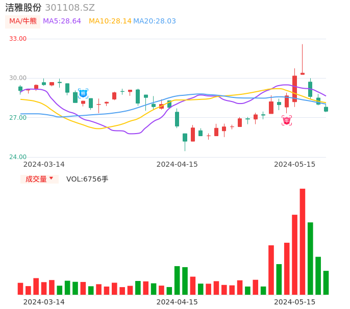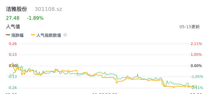 05月15日,洁雅股份收报27.48,股价涨幅-1.89%,成交金额1870.35万元,换手率1.92%。