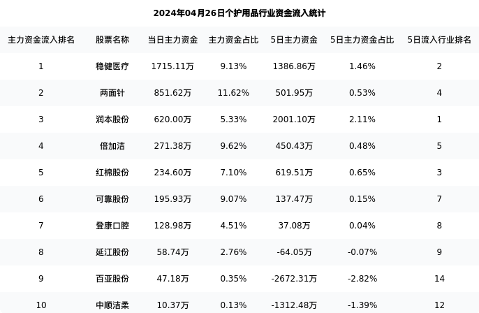 从主力资金流向来看,个护用品行业今日主力资金流入1.56亿元,在所有申万二级行业中排名:75/131。