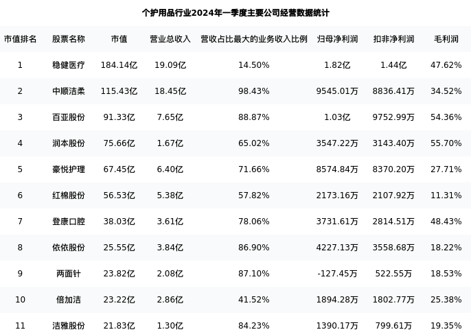 洁雅股份最新报告期数据为一季度,下表汇总了个护用品行业内市值靠前的公司一季度主要经营数据