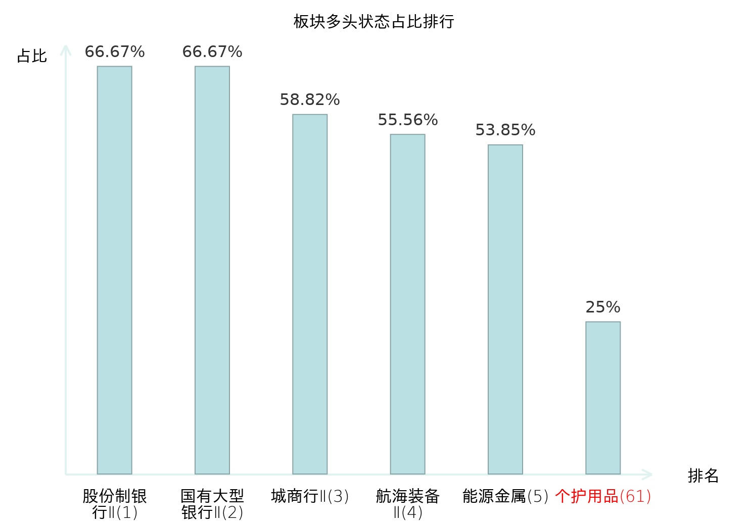 全市场所有行业板块中主力多头状态占比排名中,股份制银行Ⅱ板块位居第一。渔业板块名次提升最快,较昨日上升61位。