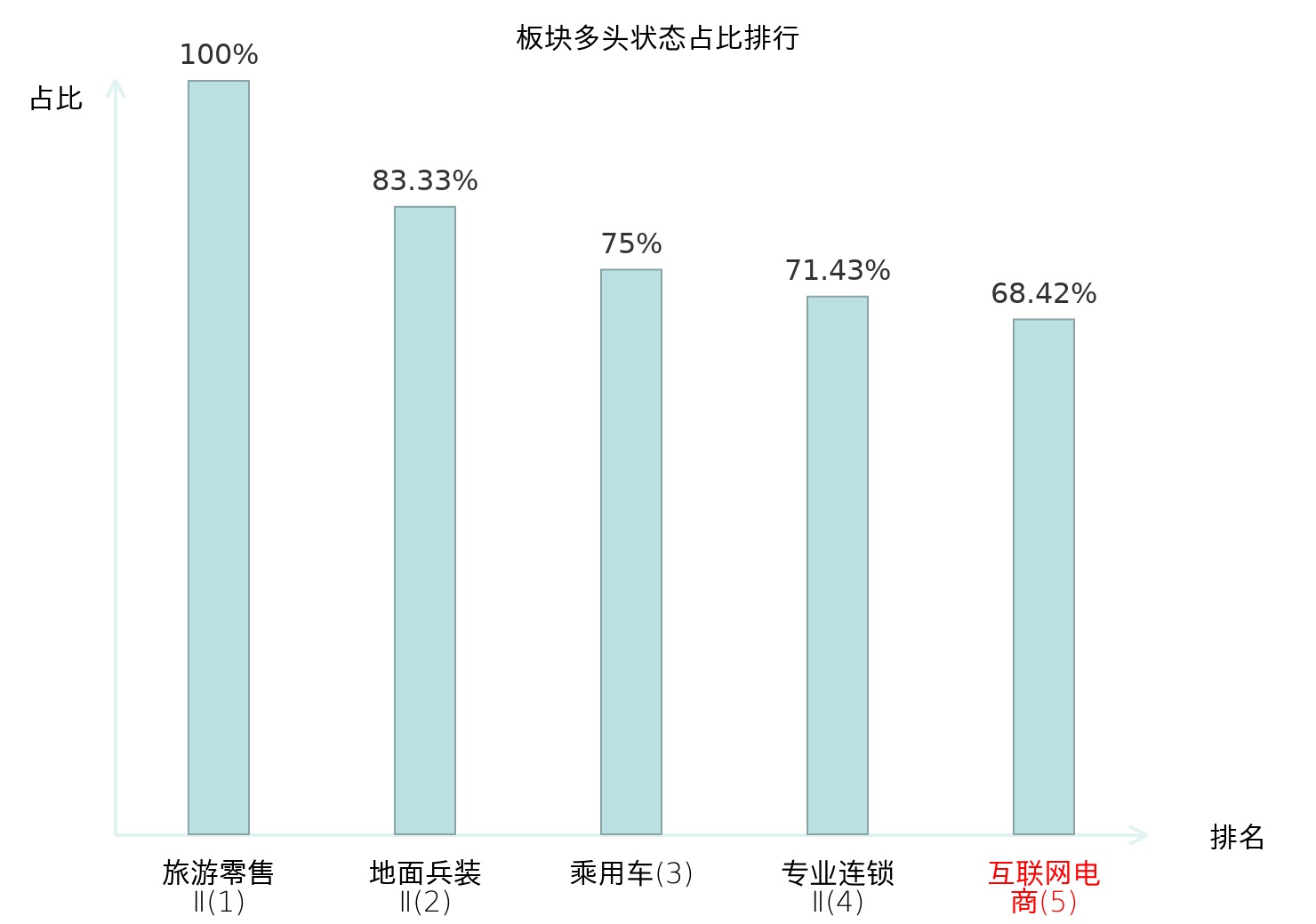 全市场所有行业板块中主力多头状态占比排名中,旅游零售Ⅱ板块位居第一。其他家电Ⅱ板块名次提升最快,较昨日上升55位。