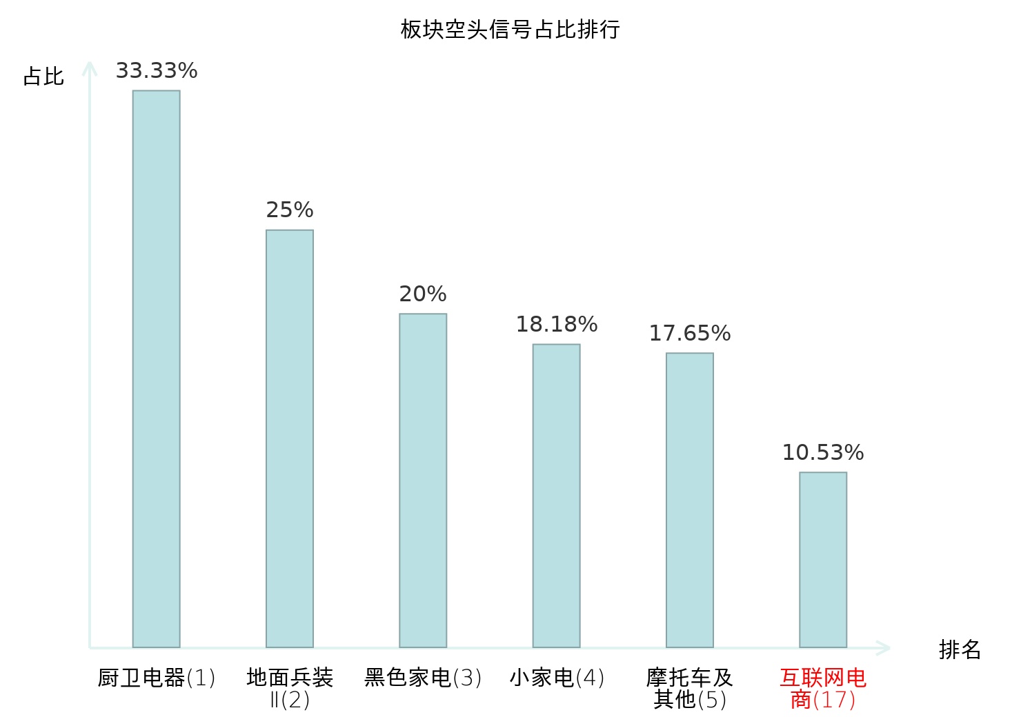 全市场所有行业板块中主力空头信号占比排名中,厨卫电器板块位居第一。服装家纺板块名次提升最快,较昨日上升124位。