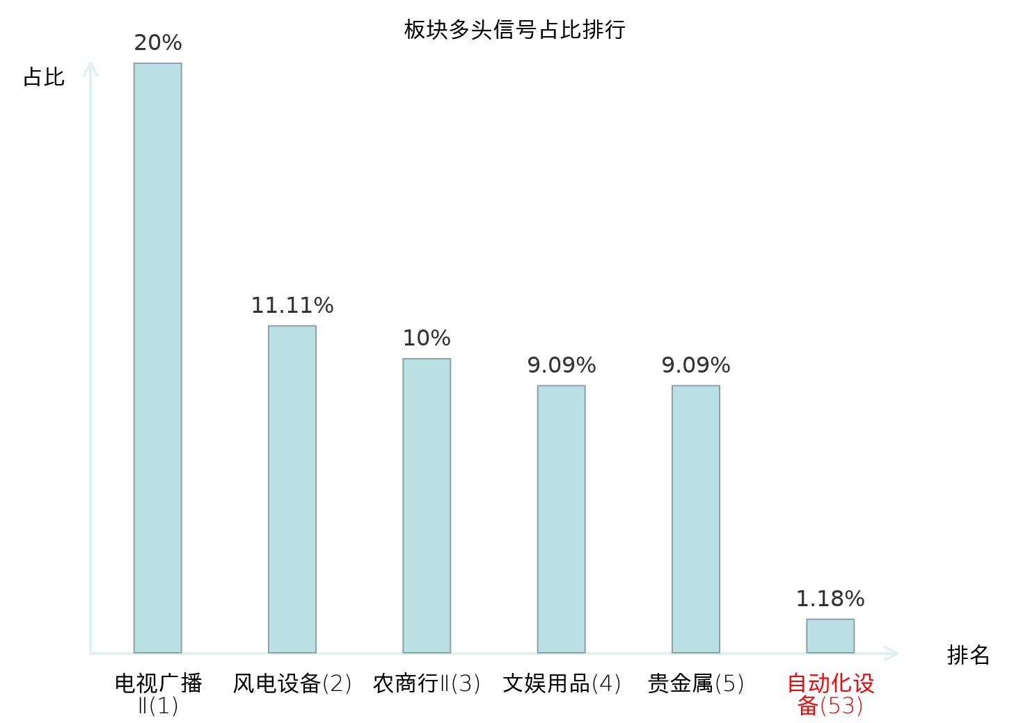 全市场所有行业板块中主力多头信号占比排名中,电视广播Ⅱ板块位居第一。农商行Ⅱ板块名次提升最快,较昨日上升112位。