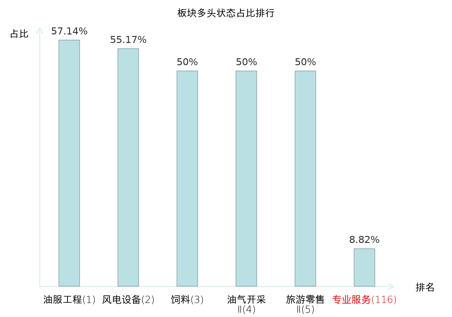 全市场所有行业板块中主力多头状态占比排名中,油服工程板块位居第一。非金属材料Ⅱ板块名次提升最快,较昨日上升67位。