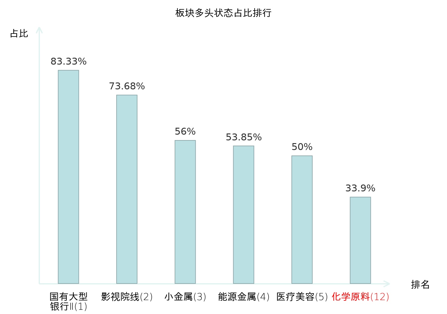 全市场所有行业板块中主力多头状态占比排名中,国有大型银行Ⅱ板块位居第一。电视广播Ⅱ板块名次提升最快,较昨日上升99位。